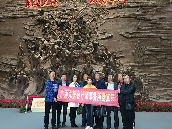 青山埋忠骨,湘江颂英灵。朝阳下的全州红军长征湘江战役纪念馆熠熠生辉,纪念馆开门不久,馆内已是人头攒动,门口排起了长长的队伍。九信会计师事务所党支部的党员同志们,怀着对革命先烈深深的敬仰之情,通过聆听讲解,观看图片、实物、影视等方式,进一步了解湘江战役脚山铺阻击战的那段烽火岁月,感悟阻击战中红军的英雄事迹和悲壮慷歌。“三年不饮湘江水,十年不食湘江鱼”。脚山铺阻击战,是湘江战役三大阻击战中规模最大的一次阻击战斗,1934年11月27日,红一军团部队渡过湘江,控制了屏山渡口至界首渡口的湘江防线,并在脚山铺阻击湘军南下。11月29日至12月1日,红一军团第一师、第二师,与湘军超过四个师的部队,在脚山铺、白沙河一带激战三个昼夜,2000多名指战员牺牲,以自己的血肉之躯,以大无畏的牺牲精神,筑起了军委纵队和后续部队抢渡湘江的生命通道。参观完毕后,广西九信会计师事务所的党员同志们纷纷表示,在今后的工作中,一定要继承和发扬好红军将士在湘江战役中体现出的“勇于胜利、勇于突破、勇于牺牲”精神,真正做到感党恩、听党话、跟党走,紧密团结在以习近平同志为核心的党中央周围,继续在自己的工作岗位上坚持以诚信为本,按照独立公正的原则,严格执行中国注册会计师独立审计准则,做一名合格的中国“经济警察”。