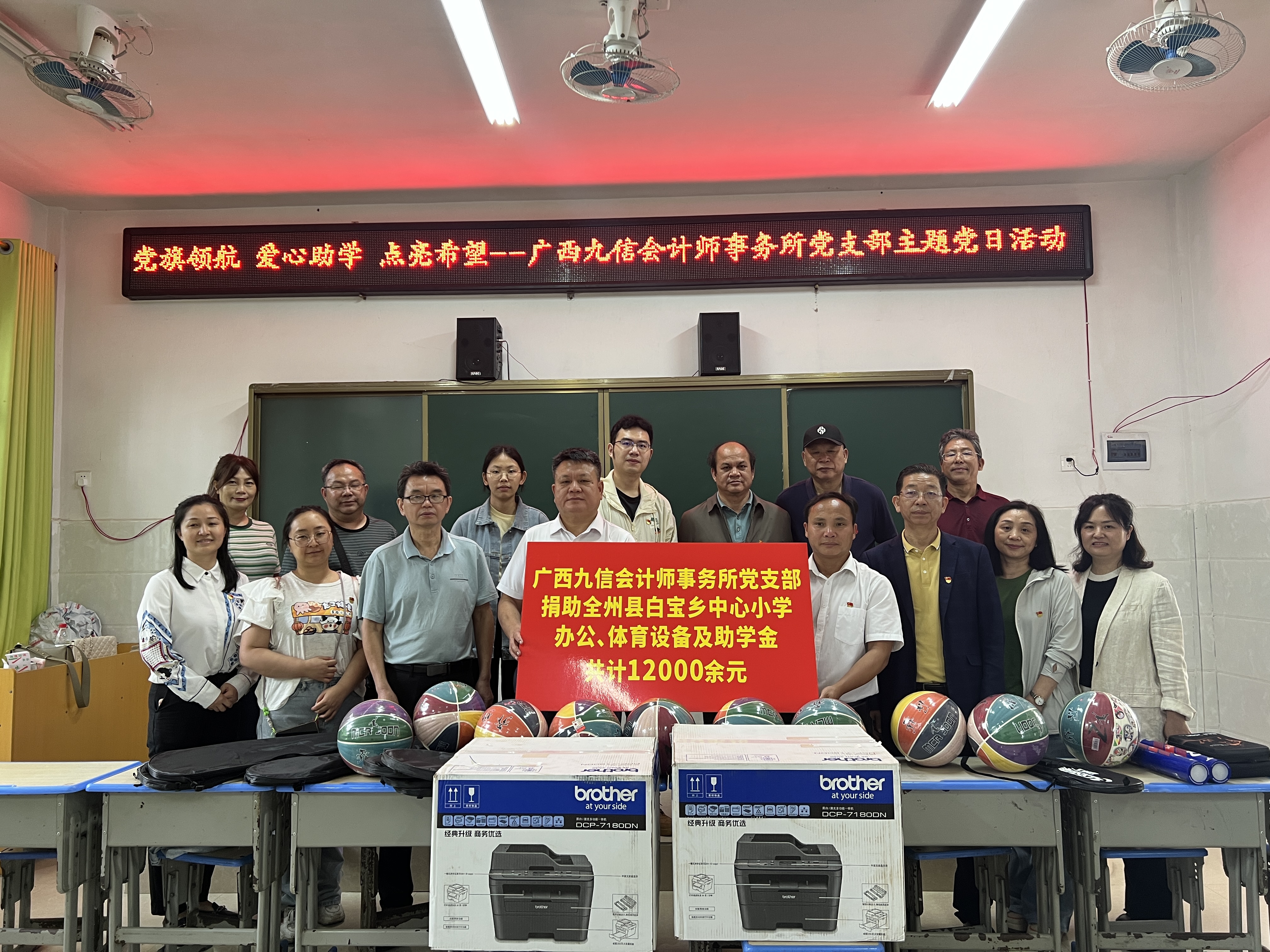本次活动广西九信会计师事务所党支部为全州县白宝乡白宝中心小学捐助学习、体育、办公等各类设备以及助学金共计12000元,不仅为学校提供打印机、乒乓球台等设备用于改善办学条件,还为15名孩子提前送去了新书包作为六一儿童节礼物。支部书记唐九胜表示,希望通过捐资助学活动让孩子们获得更好的教育,学有所成,将来实现自己的人生理想,回报家乡,建设家乡。
